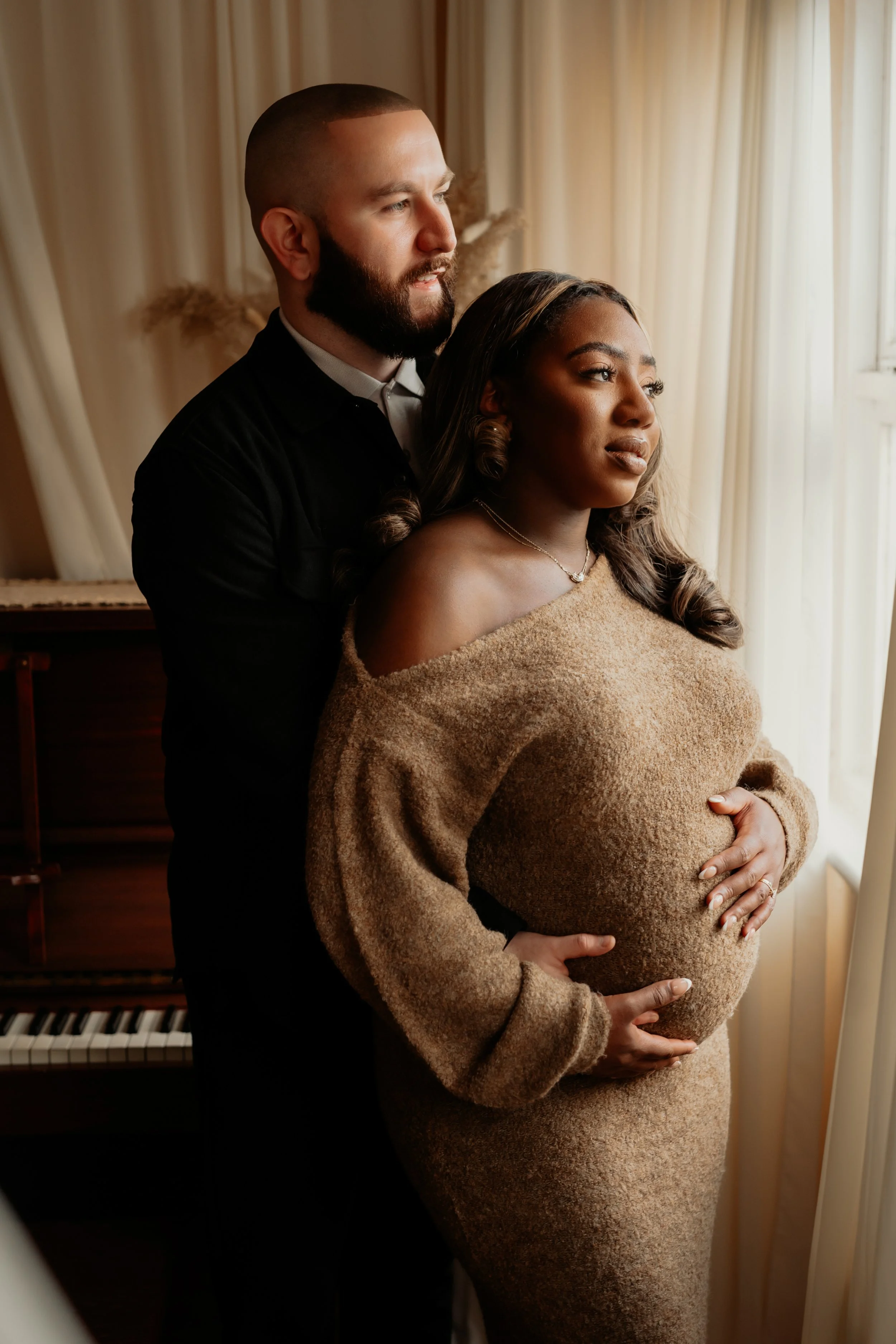 My photography studio is a place where we can create truly creative and artistic photos. It’s not a typical studio with just white walls. It’s a cozy space with many possibilities. A piano, a boho-style bed, a chaise lounge, a variety of furniture, a fireplace, and natural light streaming through the windows - all of this makes the place truly unique and a perfect space for maternity photography.